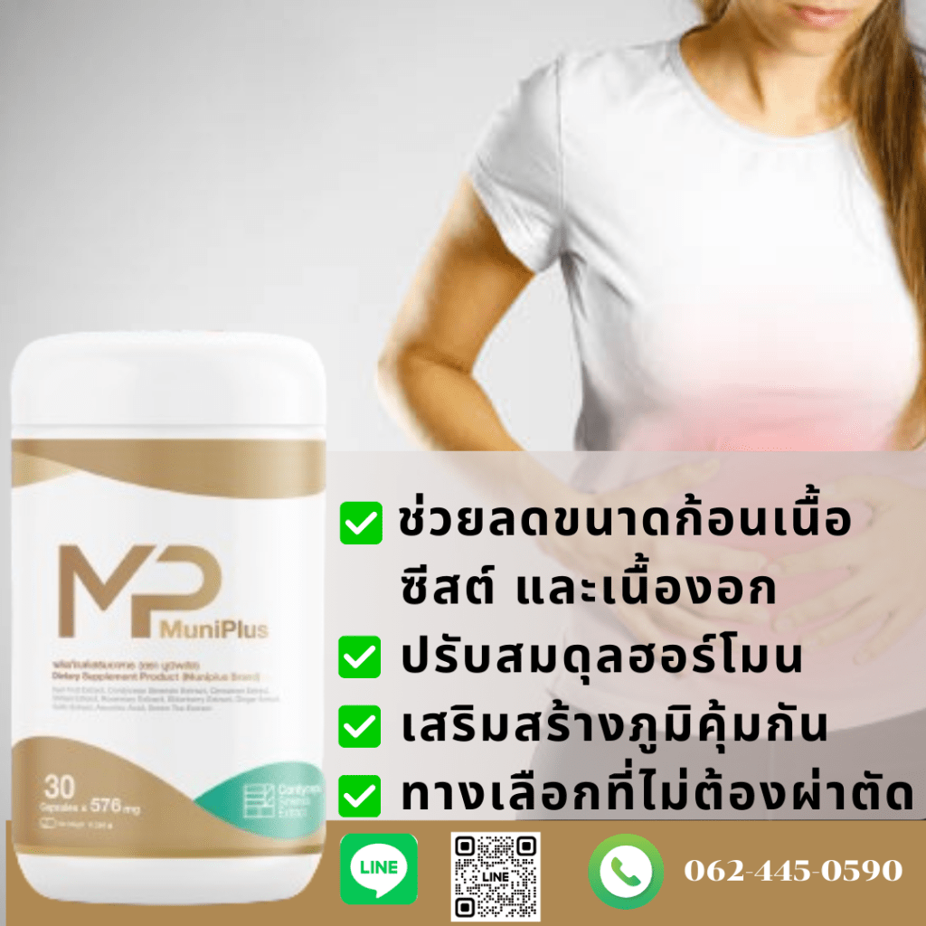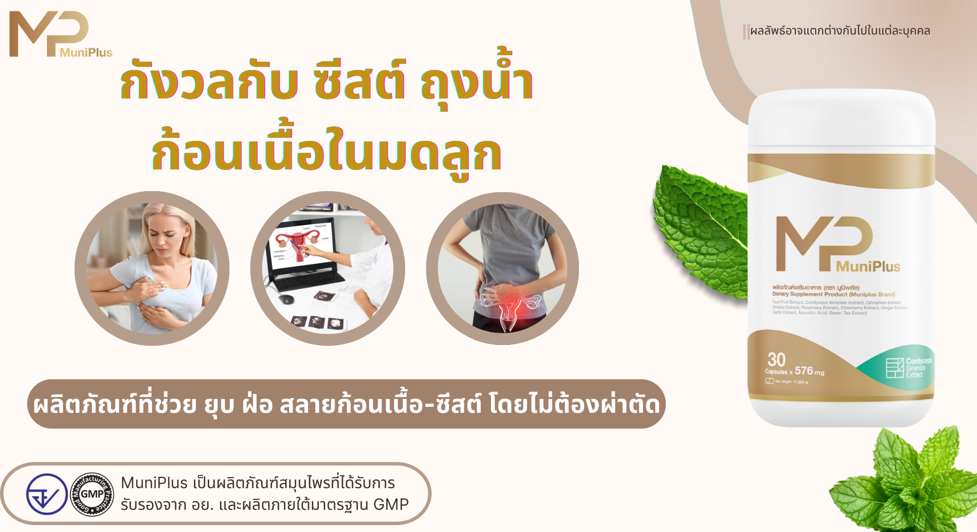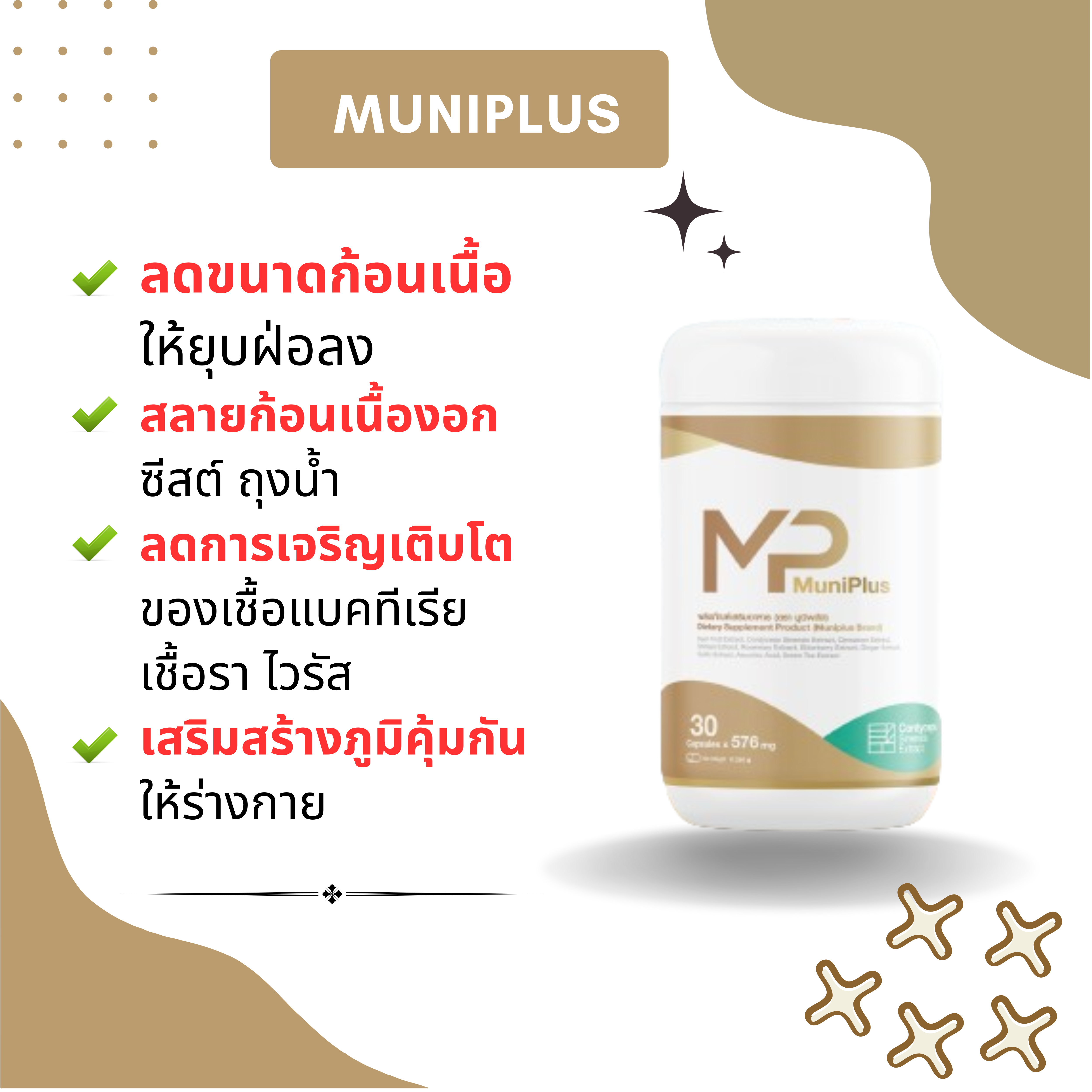 เมื่อระบบภูมิคุ้มกันแข็งแรง ร่างกายจะสามารถจัดการกับสิ่งแปลกปลอมและเซลล์ที่ผิดปกติได้ดีขึ้น MuniPlus จะเข้าไปช่วยกระตุ้นการทำงานของระบบภูมิคุ้มกัน ลดการอักเสบ และส่งเสริมการไหลเวียนโลหิต ทำให้ก้อนเนื้องอก ซีสต์ และถุงน้ำค่อยๆ ยุบฝ่อและสลายไปได้ในที่สุด