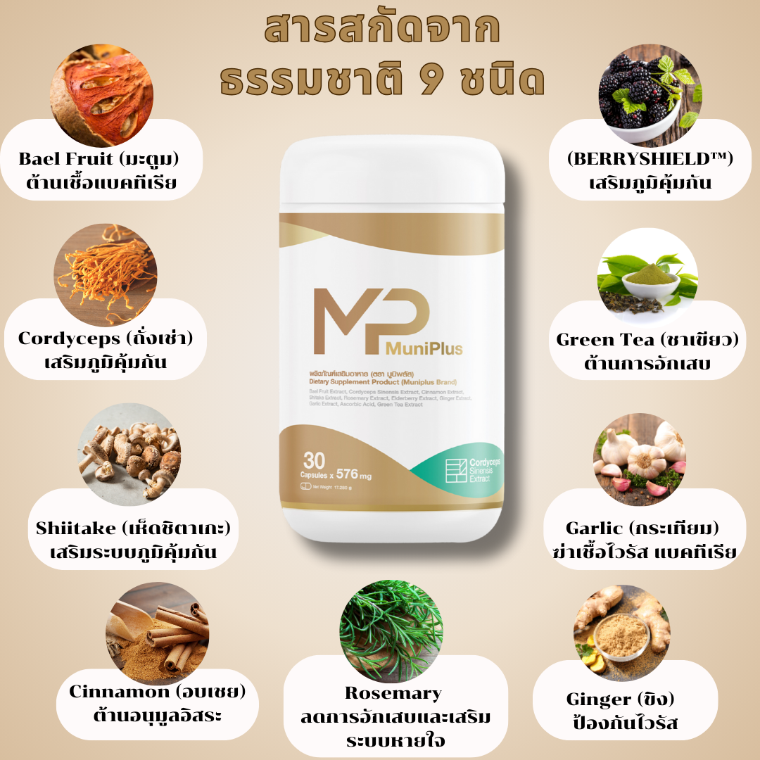 MuniPlus เป็นผลิตภัณฑ์เสริมอาหารที่อุดมไปด้วยสารสกัดจากธรรมชาติ 9 ชนิด เพื่อสุขภาพที่ดีจากภายใน